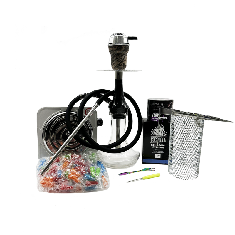 В комплект входит: Кальян Totem Hookah Monolit Micra Black (чёрный, полный комплект) Колба Шланг Мундштук Уплотнители Диффузор Электроплита, электропечь для угля 1000W White (1 конфорка) Пружина для силиконового шланга для кальяна. Щипцы для кальяна Amy Silver Long (Металлик) Стабилизатор жара Калауд (Металлик) Вилка металлическая для табака Chameleon (Хамелеон) Шило для фольги для кальяна пластиковая ручка (Зеленый) Одноразовые мундштуки для кальяна (Разноцветные, конус с бортиком) Глиняная чаша Solaris Phobos (Коричневая глина) Сетка-Ковпак для кальяна Silver (Металлик) Кокосовый уголь для кальяна Cocoloco (1 кг, 72 шт, р25) Табак 420 Captain Baldezh (Грушевый Лимонад, 100 г) Табак Flow Ягодный Морс (100 г)