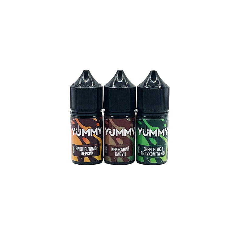 В набор входят: Жидкость YUMMY Энергетик с Яблоком и Киви (30 мл) Жидкость YUMMY Вишня Лимон Персик (30 мл) Жидкость YUMMY Ледяной Арбуз (30 мл)