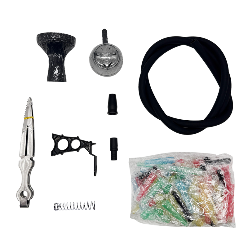 Комплектація: Шахта Блюдце Колба Шланг Мундштук Чаша (силіконова) Калауд Щипці Ущільнювачі Дифузор Утримувач мундштука Одноразові мундштуки